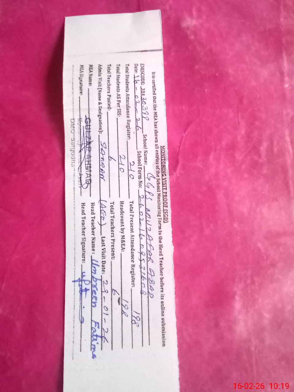 | Attendance Register | Head Teacher | MEA with School | Visit Proof |
