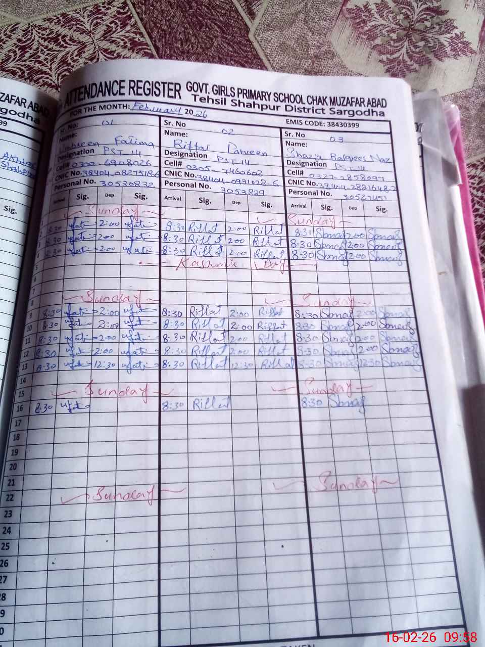 | CNIC | Full Name | Designation | R/C | Absence During Last Calender Month |