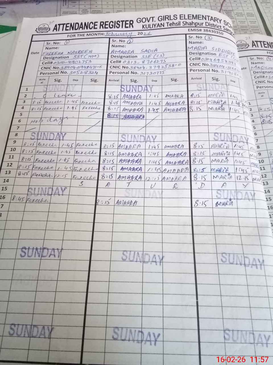 | CNIC | Full Name | Designation | R/C | Absence During Last Calender Month |