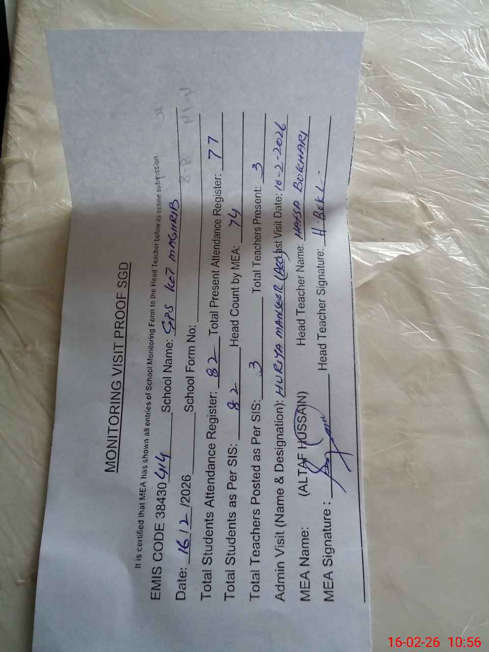 | Attendance Register | Head Teacher | MEA with School | Visit Proof |