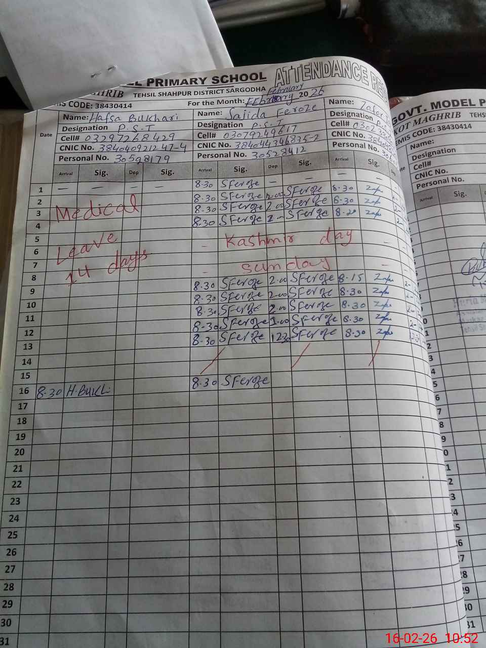 | CNIC | Full Name | Designation | R/C | Absence During Last Calender Month |