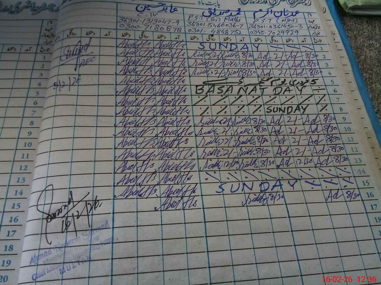 | CNIC | Full Name | Designation | R/C | Absence During Last Calender Month |