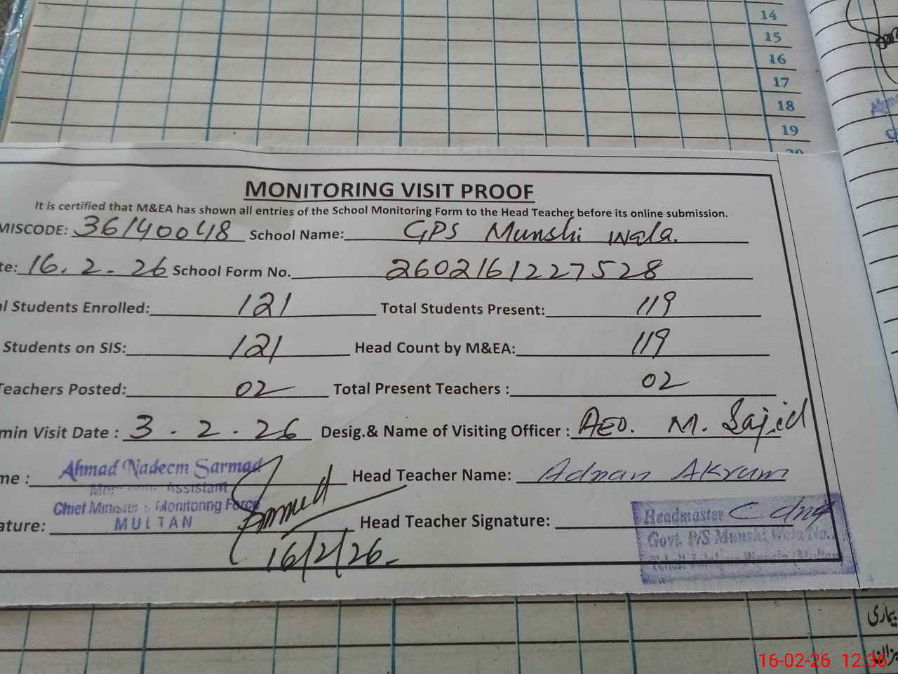 | Attendance Register | Head Teacher | MEA with School | Visit Proof |