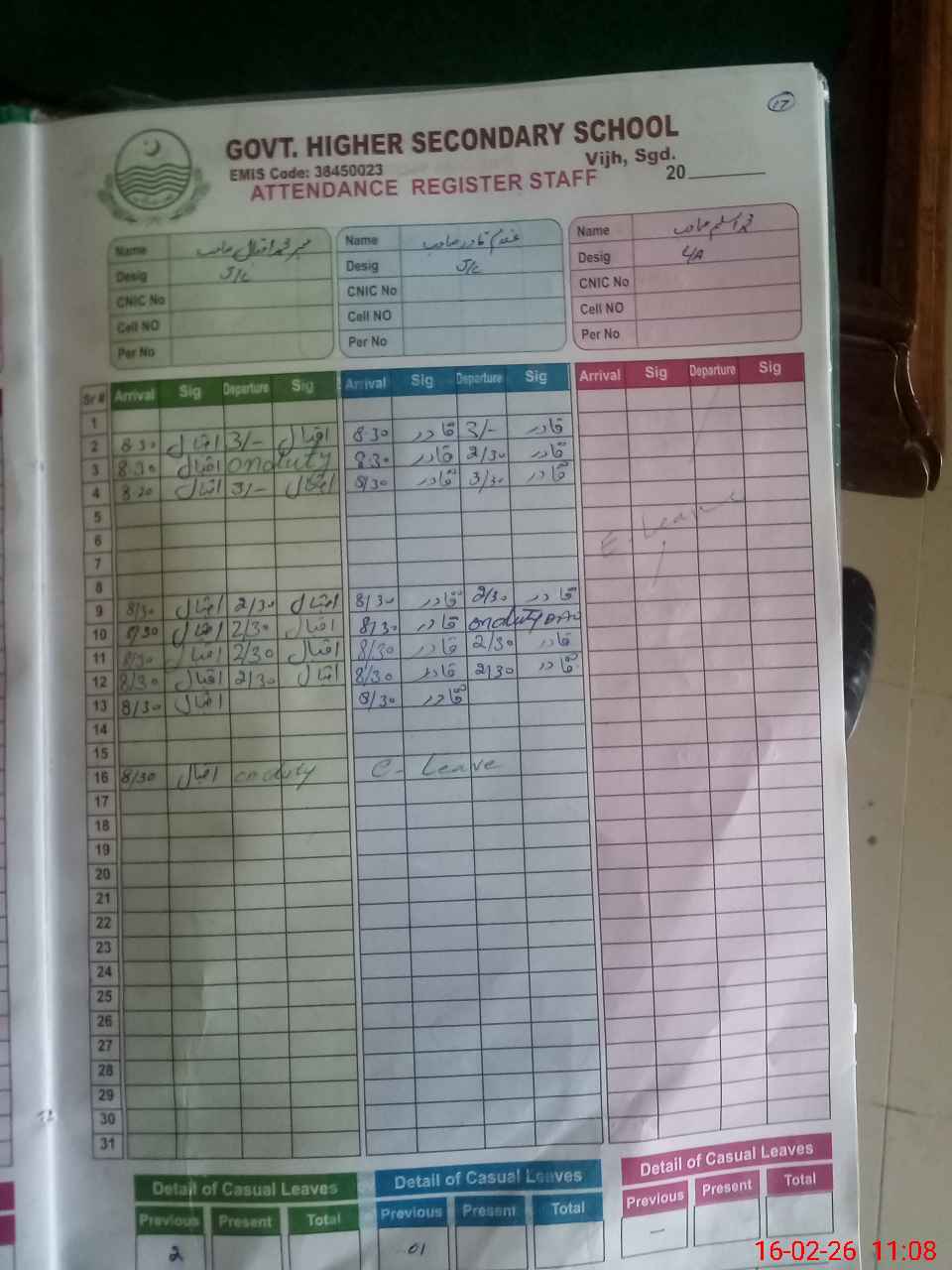 | CNIC | Full Name | Designation | R/C | Absence during last cal. month |