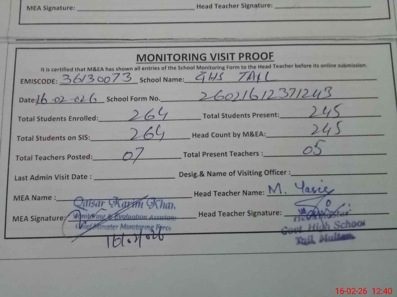 | Certified that this School was Inspected by the Undersigned MEA/DMO Today and the Information Stated Above is as Per Record. | |||||