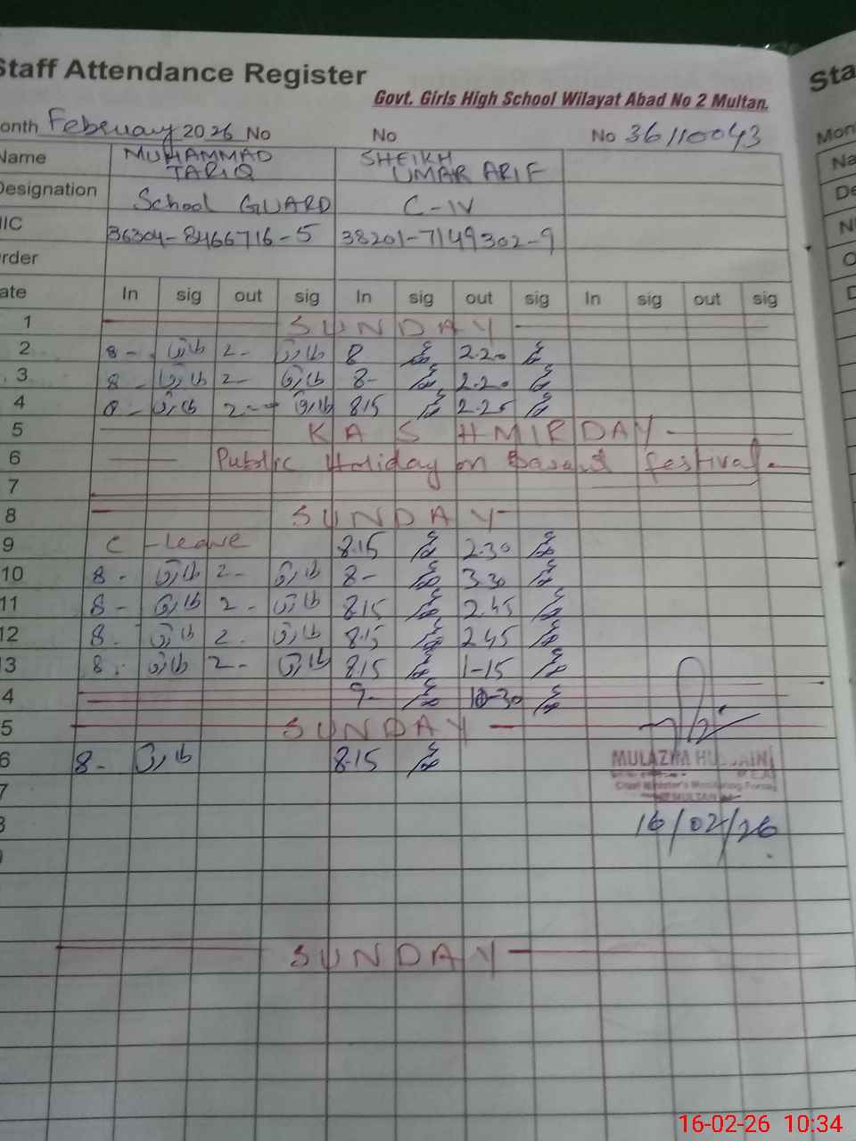 | CNIC | Full Name | Designation | R/C | Absence During Last Calender Month |