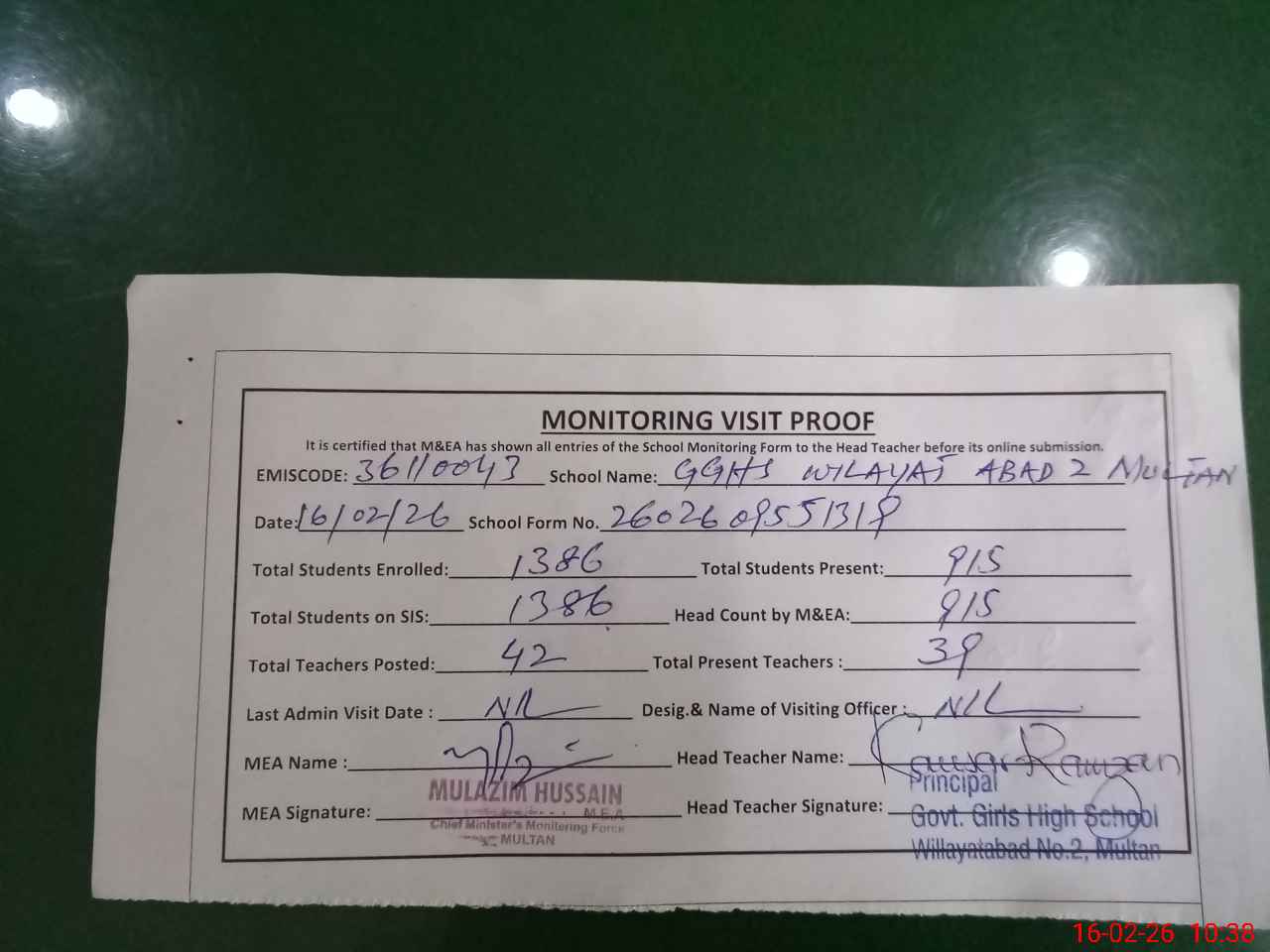 | Certified that this School was Inspected by the Undersigned MEA/DMO Today and the Information Stated Above is as Per Record. | |||||