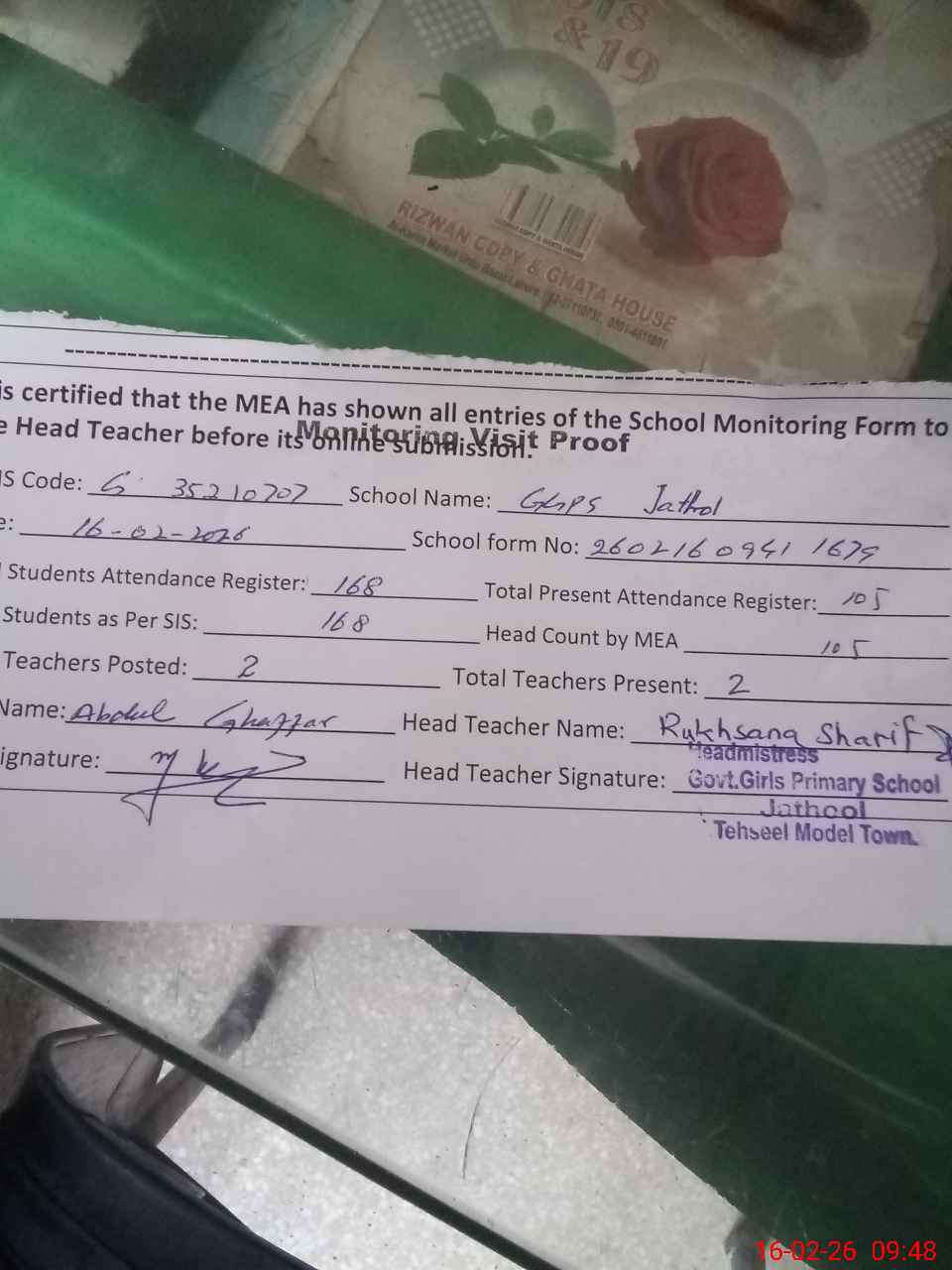 | EMIS Code: 35210707 | Name of School: GGPS JATHOL TEHSIL MODEL TOWN | |||