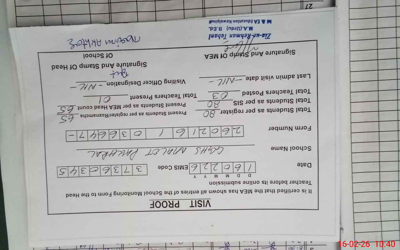 | Attendance Register | Head Teacher | MEA with School | Visit Proof |