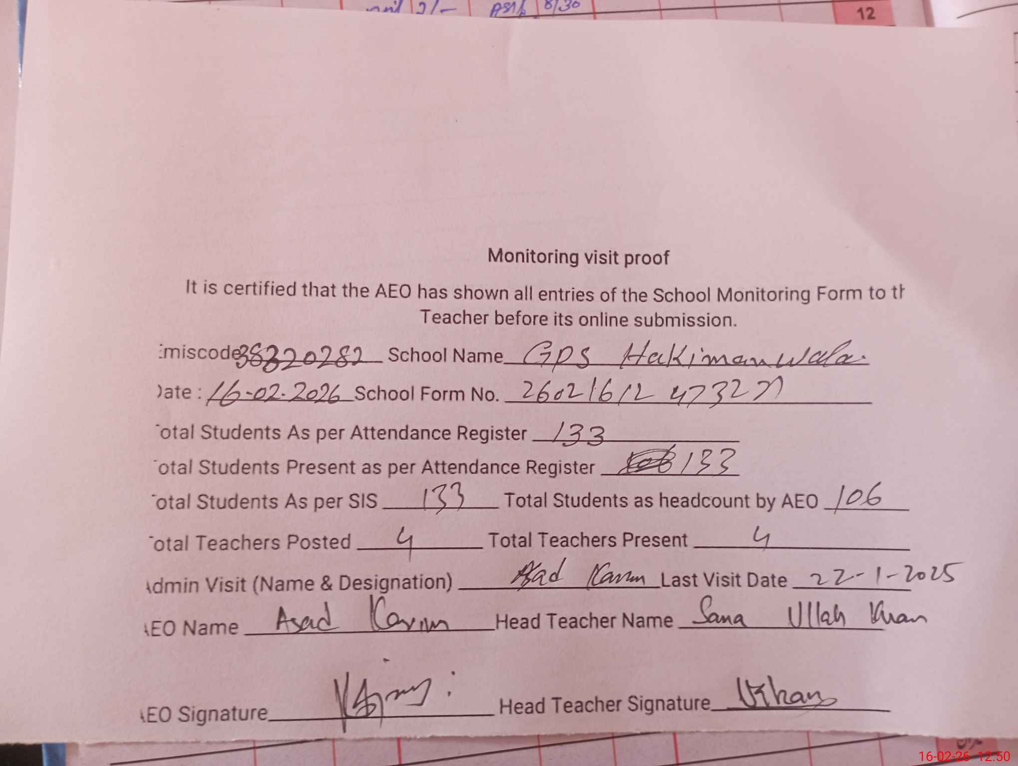 | Attendance Register | Head Teacher | MEA with School | Visit Proof |
