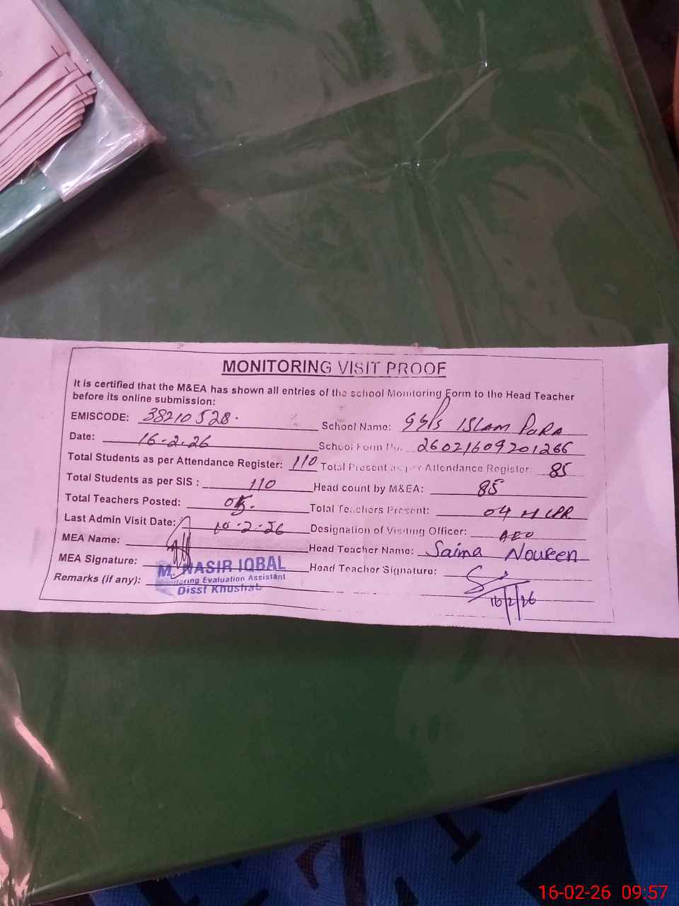 | Attendance Register | Head Teacher | MEA with School | Visit Proof |