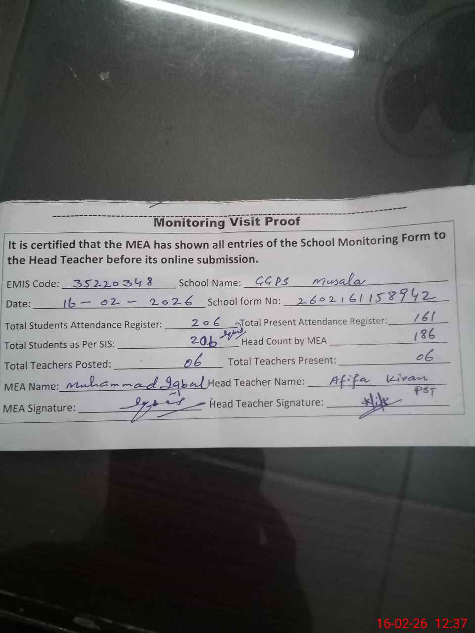 | Attendance Register | Head Teacher | MEA with School | Visit Proof |