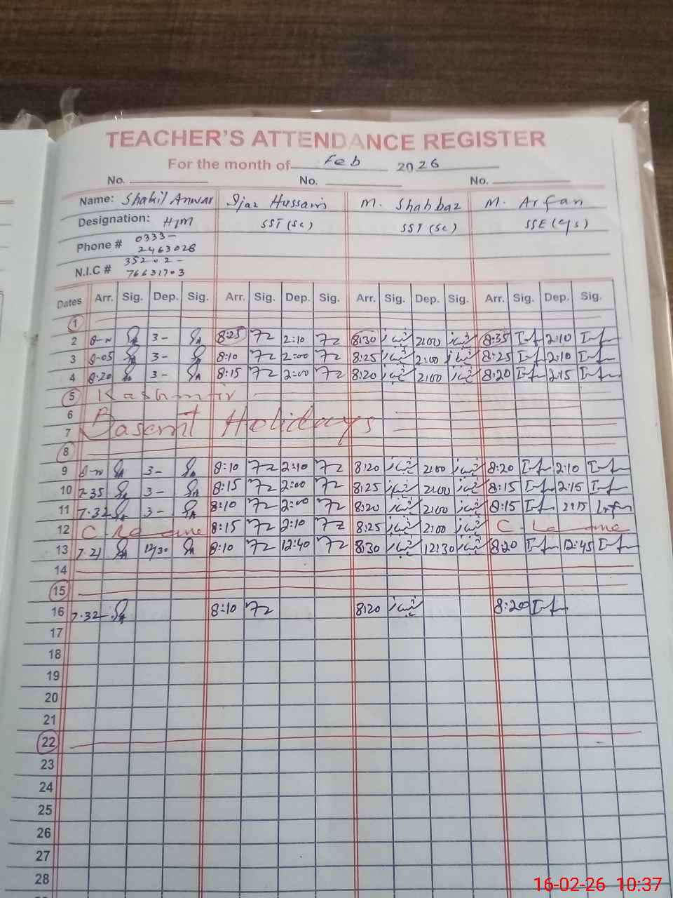 | CNIC | Full Name | Designation | R/C | Absence during last cal. month |