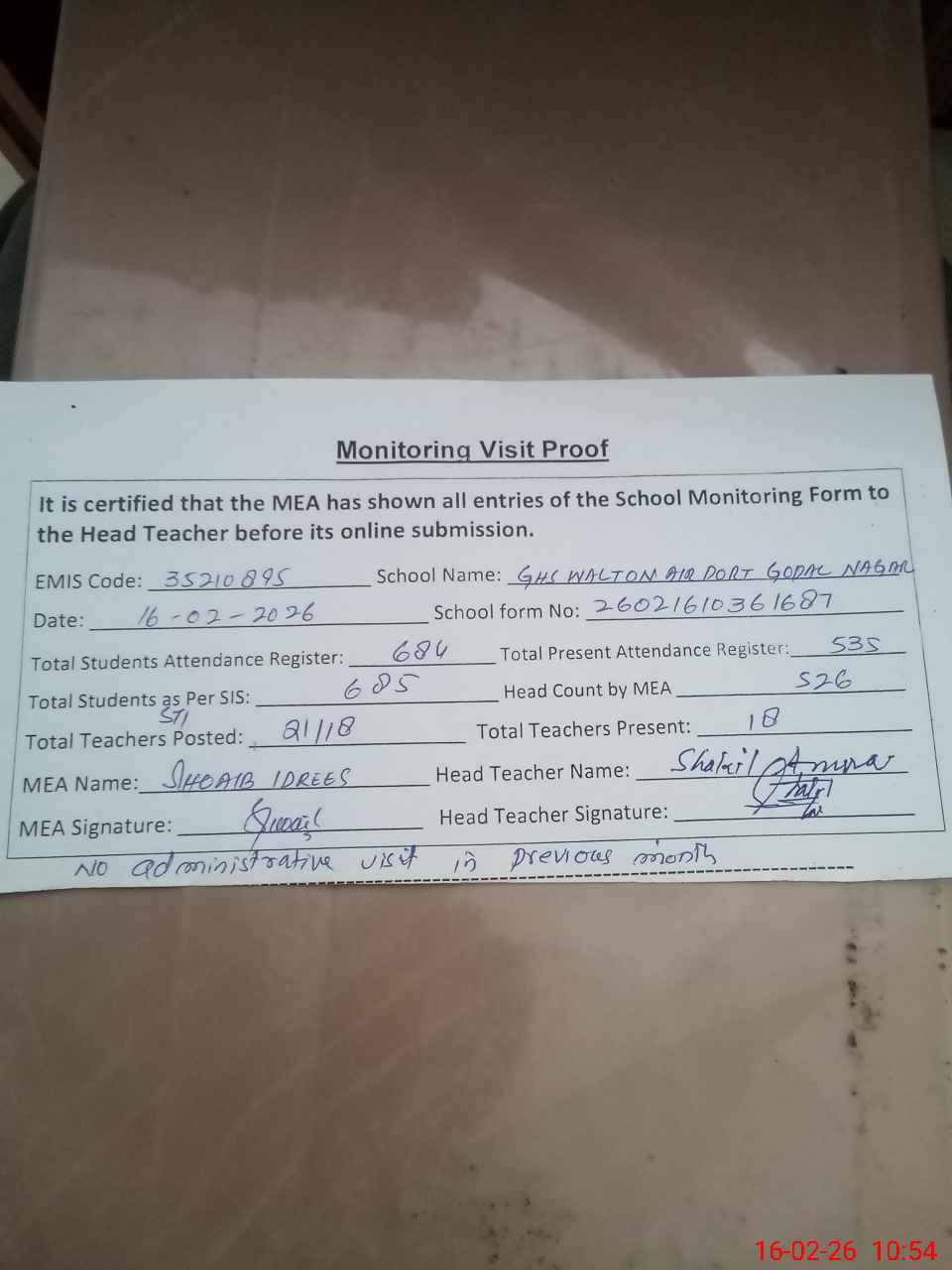 | Attendance Register | Head Teacher | MEA with School | Visit Proof |