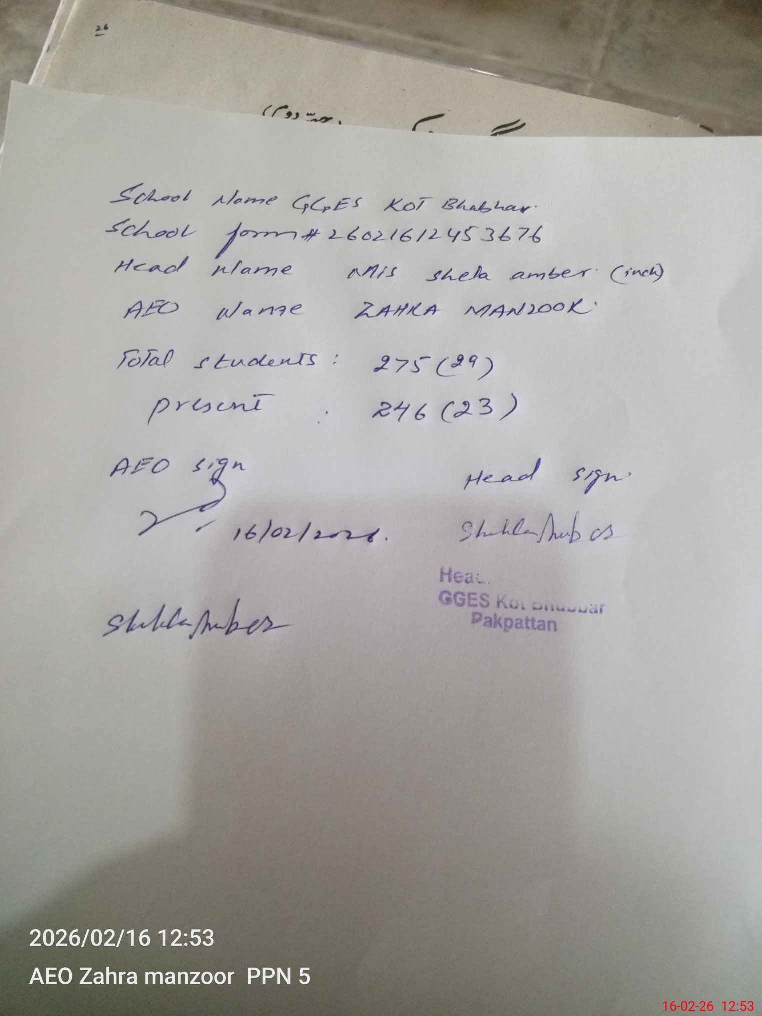 | Name: SY**** ME**** RA**** Designation: (School Headmaster's/Headmistress's) SSE SCIENCE Phone/Cell Number: 03**** |