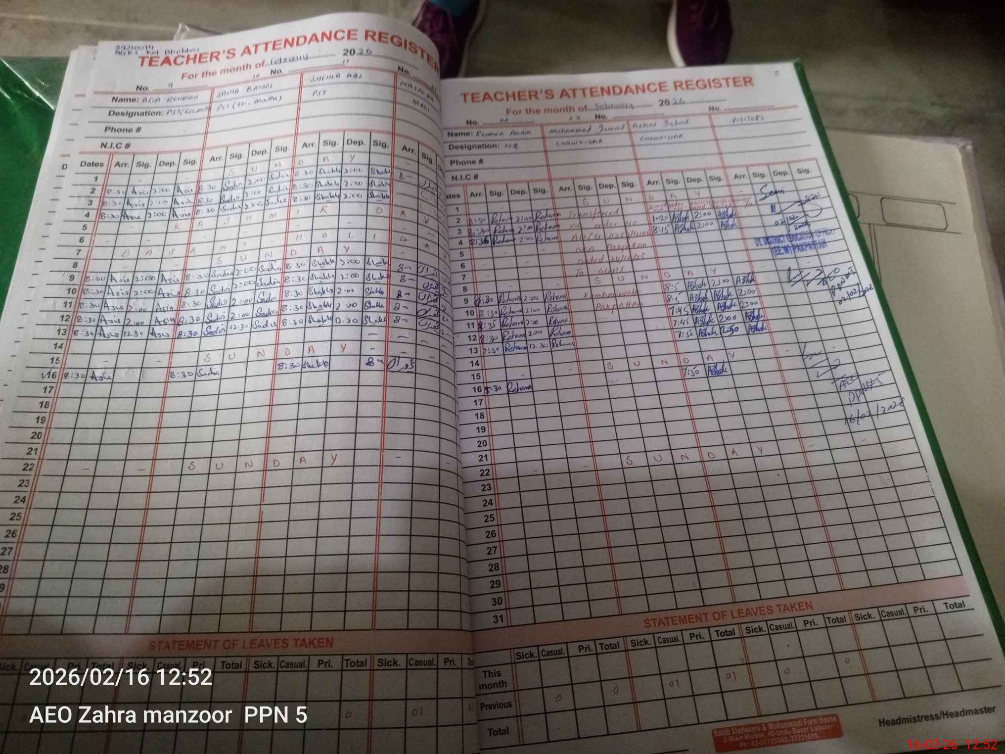 | CNIC | Full Name | Designation | R/C | Absence During Last Calender Month |