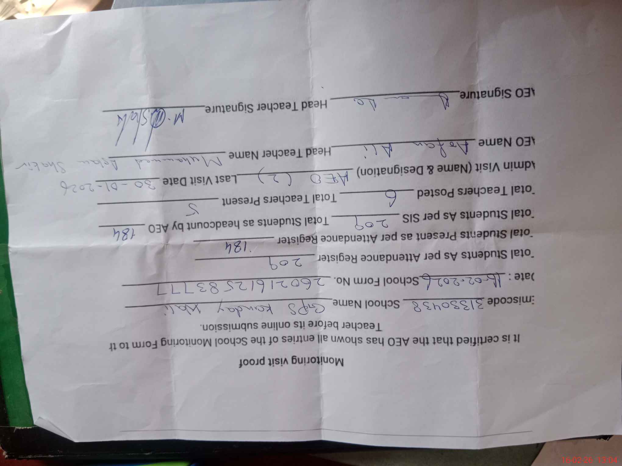 | Attendance Register | Head Teacher | MEA with School | Visit Proof |