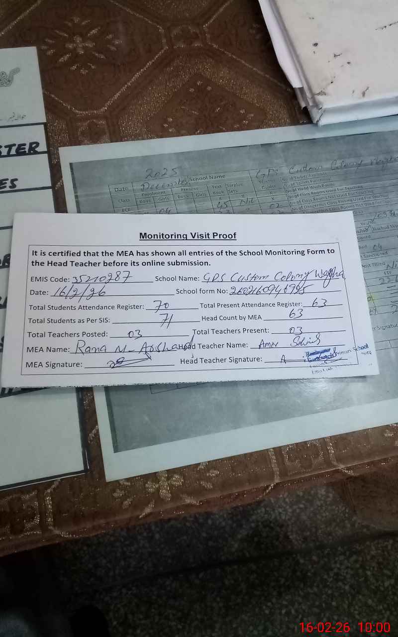 | EMIS Code: 35210287 | Name of School: GPS CUSTOM COLONY WAHGA | |||