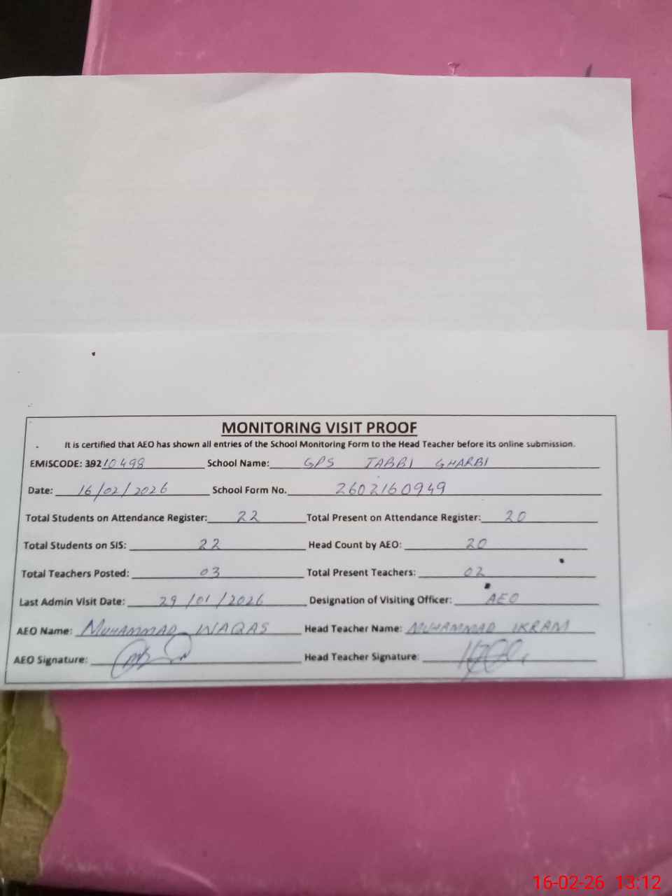 | Attendance Register | Head Teacher | MEA with School | Visit Proof |