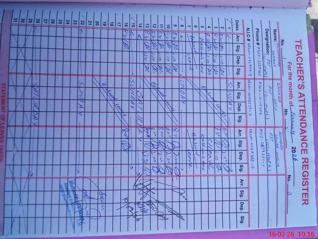 | CNIC | Full Name | Designation | R/C | Absence During Last Calender Month |