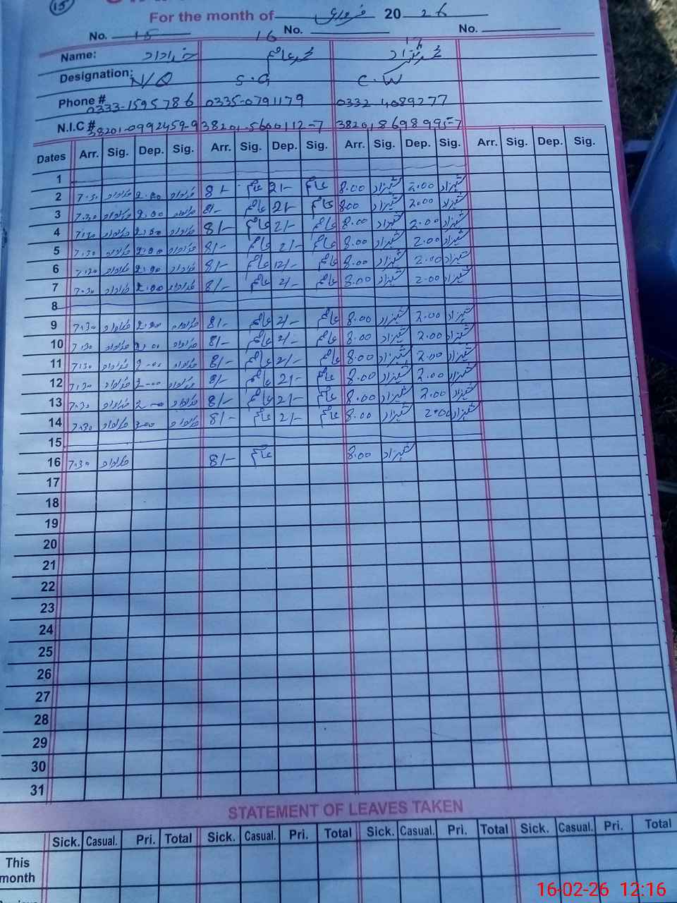 | CNIC | Full Name | Designation | R/C | Absence during last cal. month |
