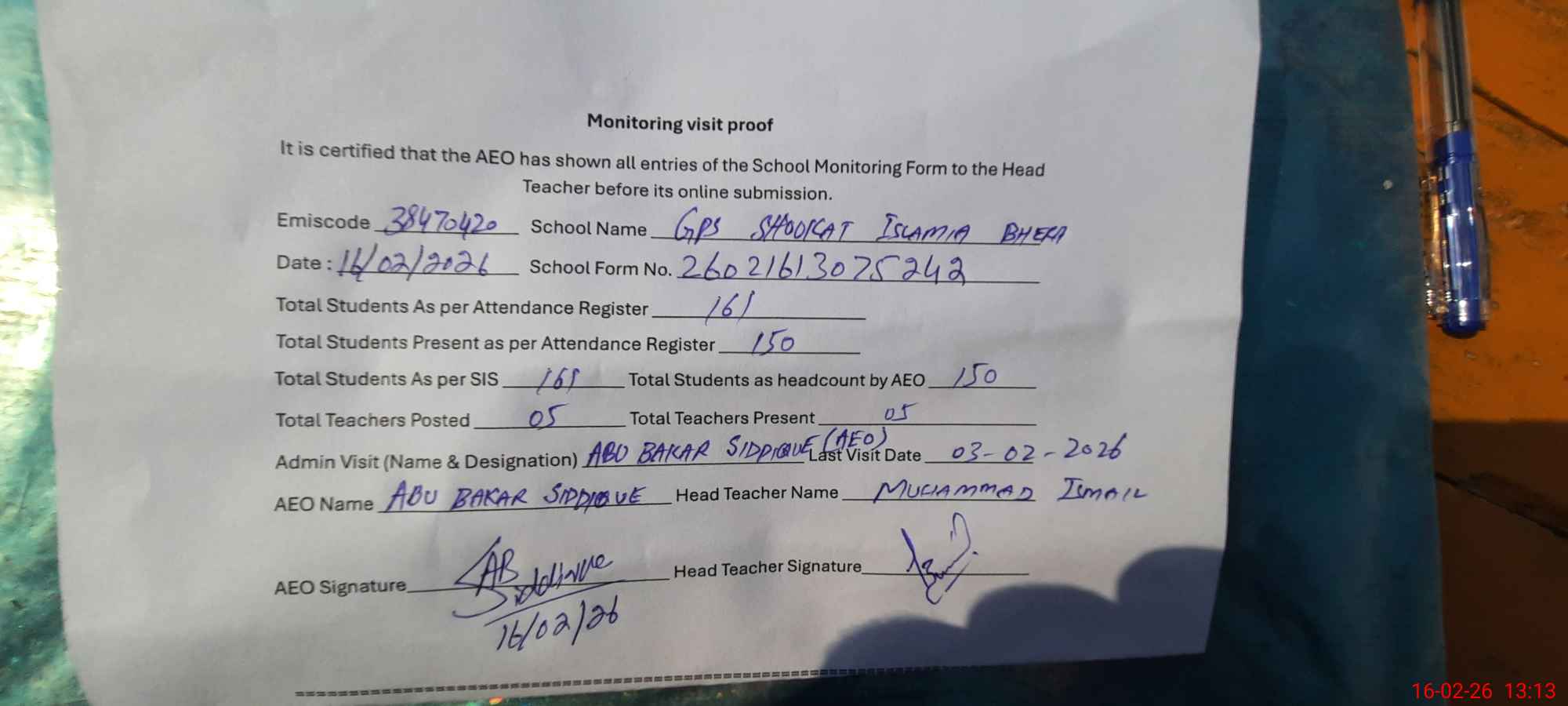 | Attendance Register | Head Teacher | MEA with School | Visit Proof |