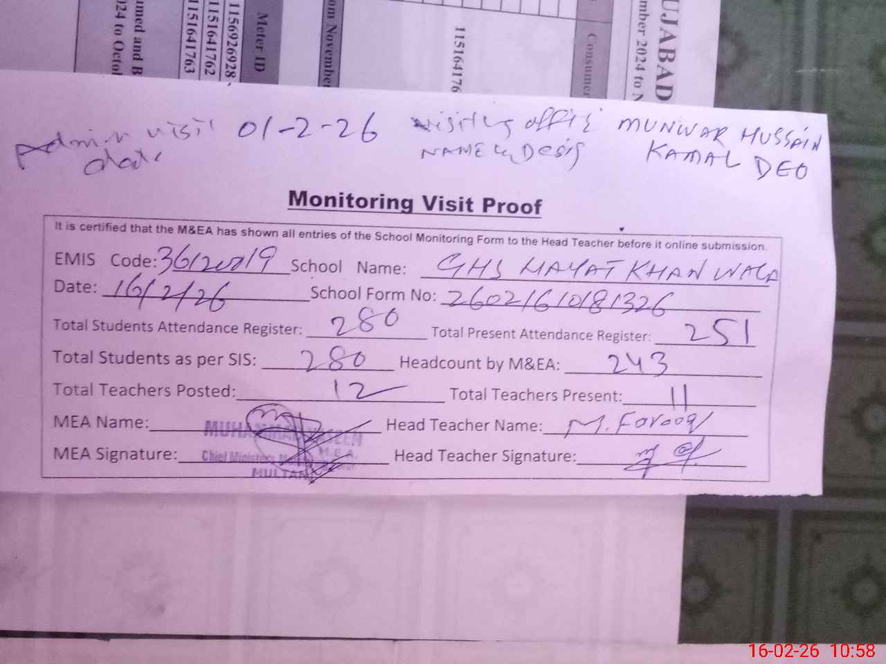 | EMIS Code: 36120019 | Name of School: GHS HAYAT KHAN WALA SHUJABAD | |||