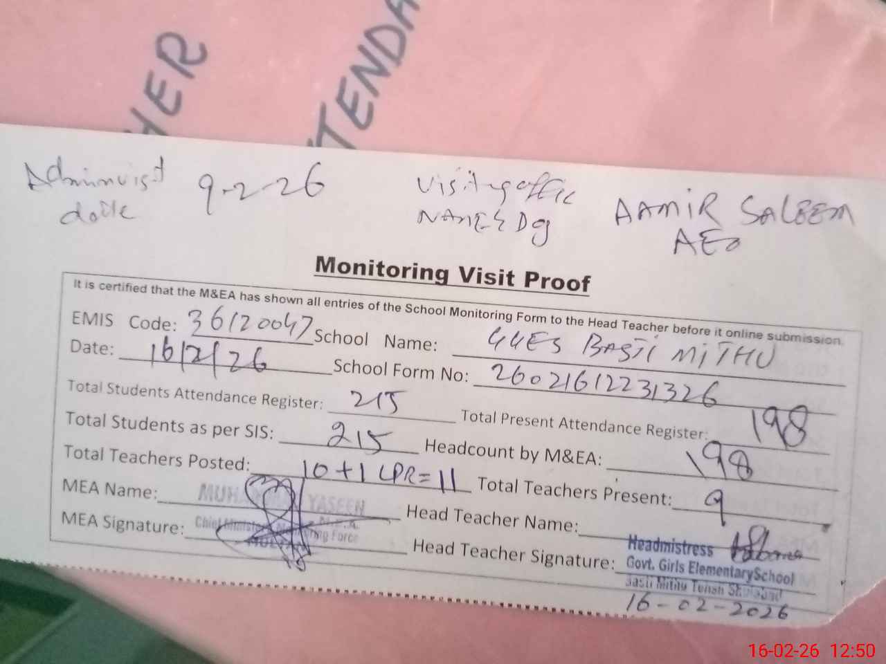 | Certified that this School was Inspected by the Undersigned MEA/DMO Today and the Information Stated Above is as Per Record. | |||||