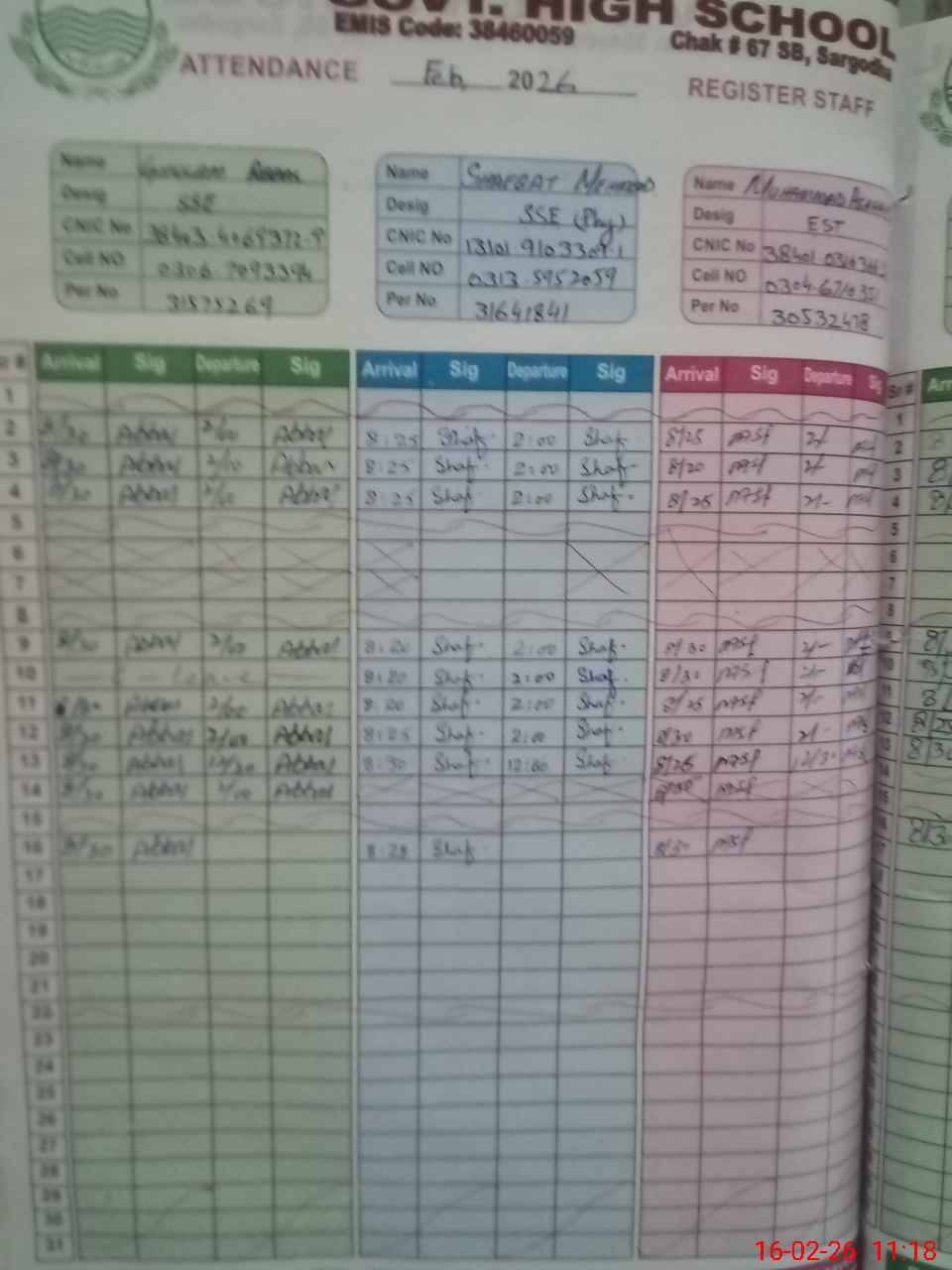 | CNIC | Full Name | Designation | R/C | Absence during last cal. month |