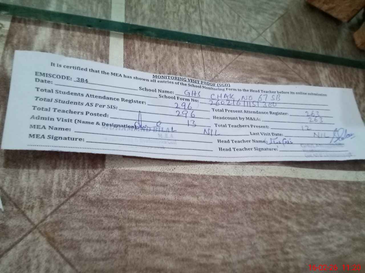| Attendance Register | Head Teacher | MEA with School | Visit Proof |