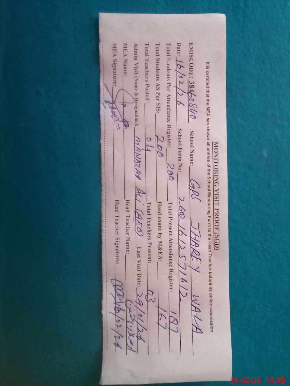 | Attendance Register | Head Teacher | MEA with School | Visit Proof |