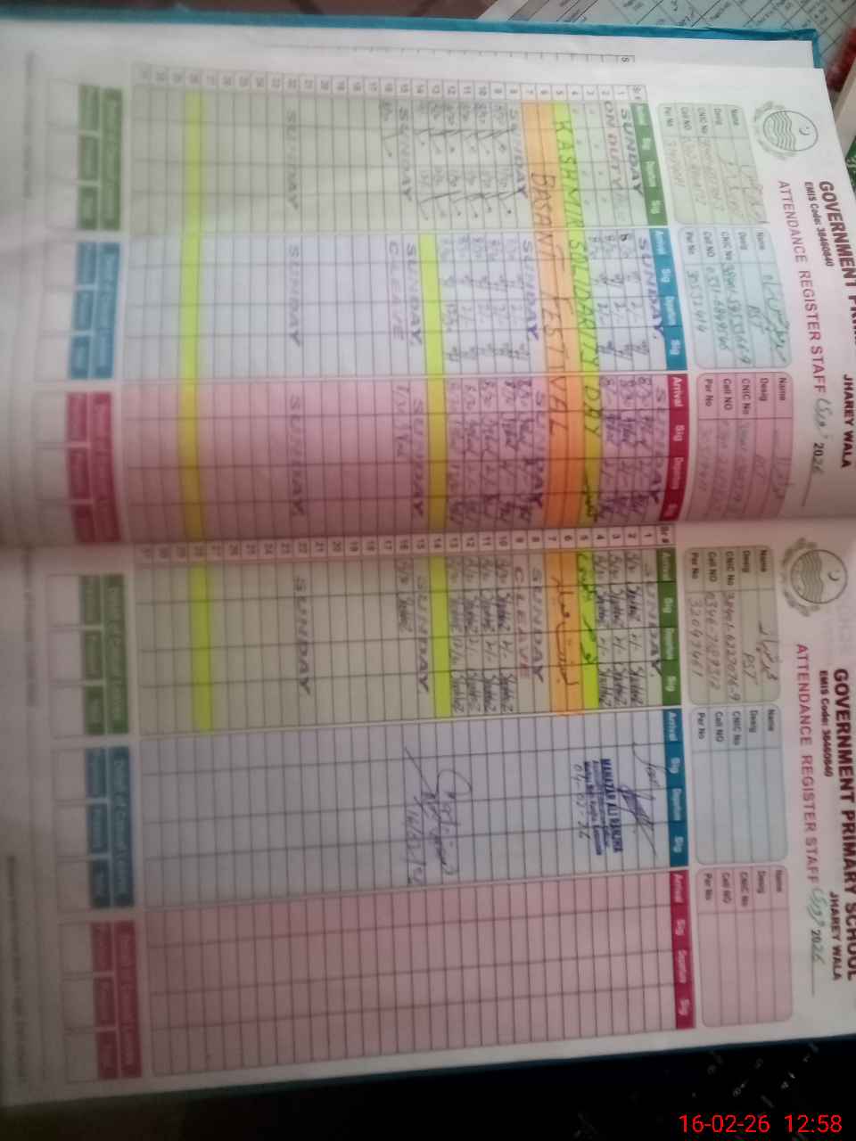 | CNIC | Full Name | Designation | R/C | Absence During Last Calender Month |