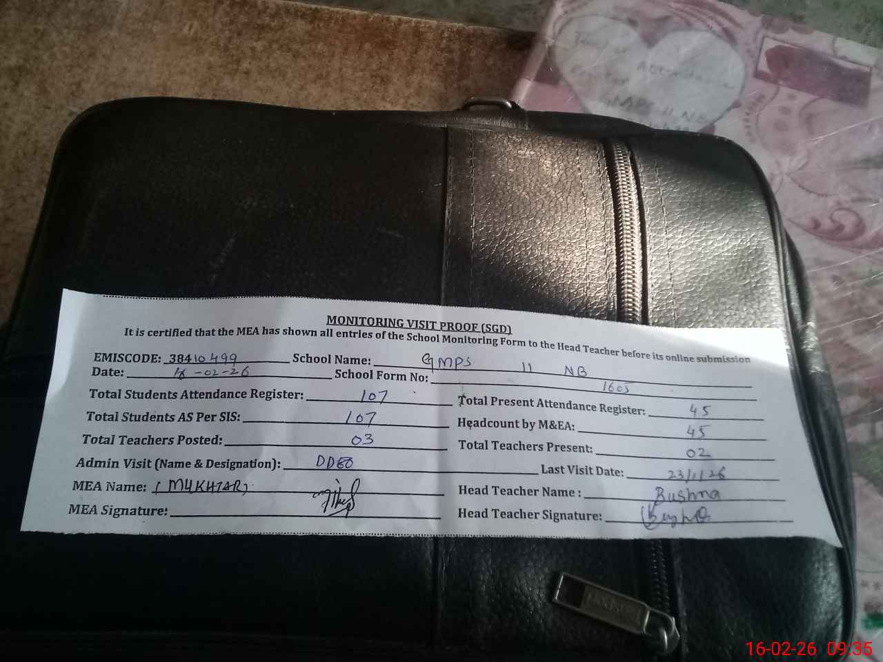 | Certified that this School was Inspected by the Undersigned MEA/DMO Today and the Information Stated Above is as Per Record. | |||||
