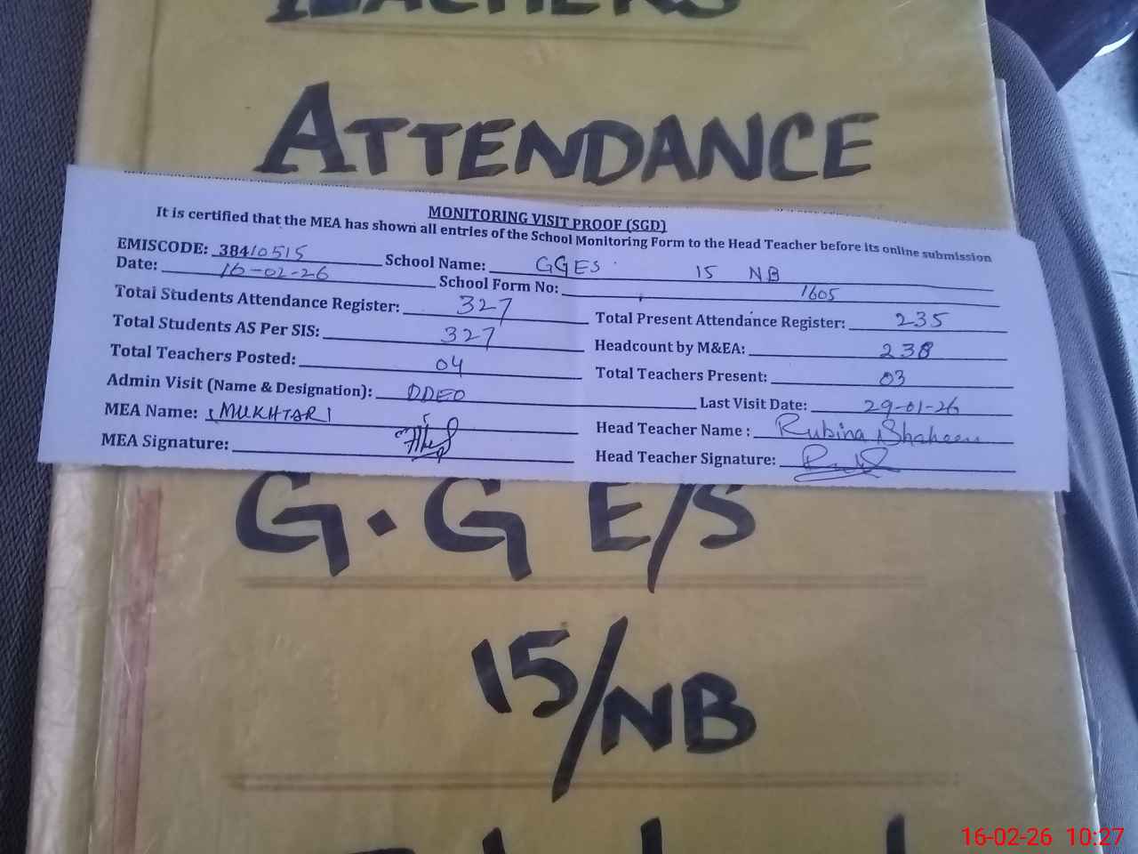 | Attendance Register | Head Teacher | MEA with School | Visit Proof |
