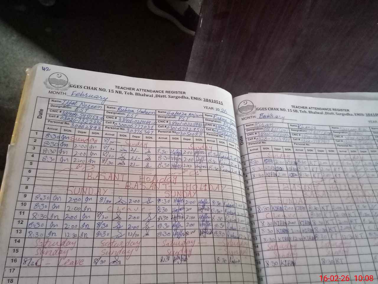 | CNIC | Full Name | Designation | R/C | Absence During Last Calender Month |