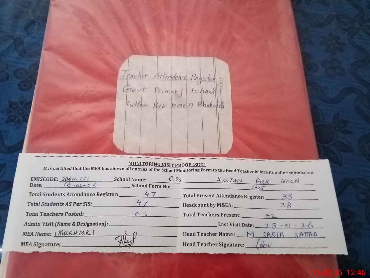 | EMIS Code: 38410151 | Name of School: GPS SULTAN PUR NOON | |||