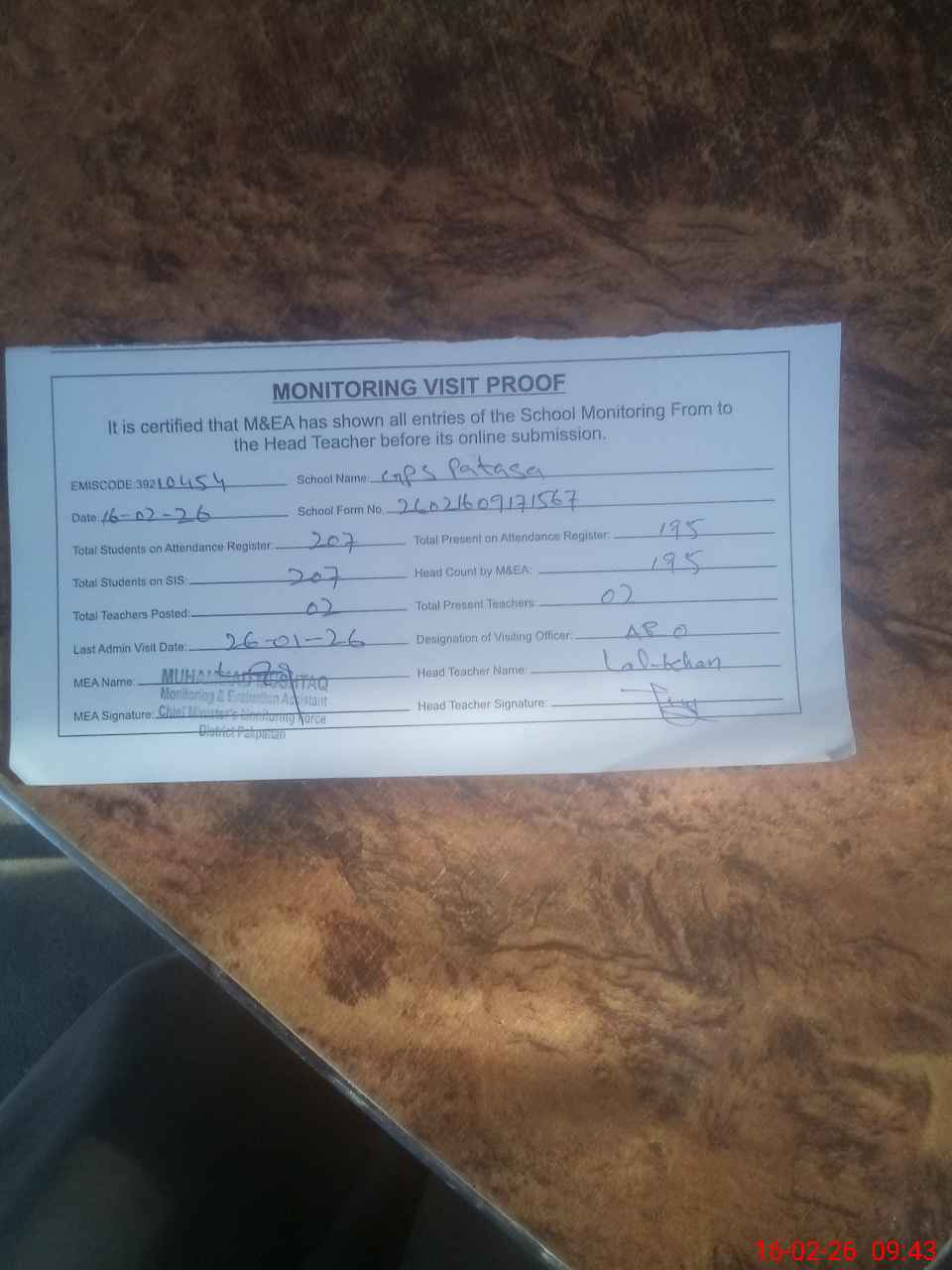 | Attendance Register | Head Teacher | MEA with School | Visit Proof |