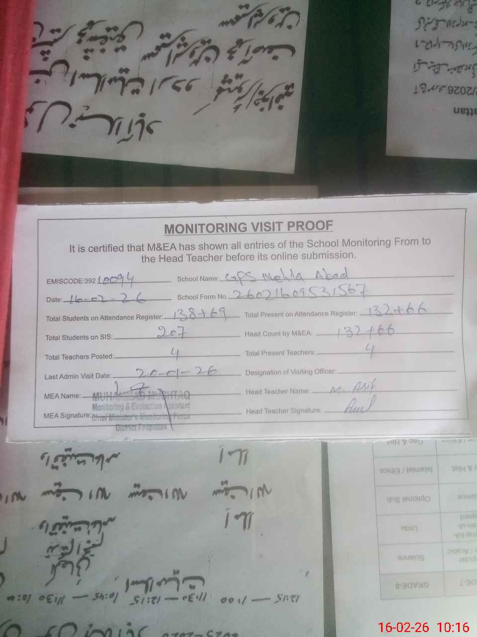 | Certified that this School was Inspected by the Undersigned MEA/DMO Today and the Information Stated Above is as Per Record. | |||||