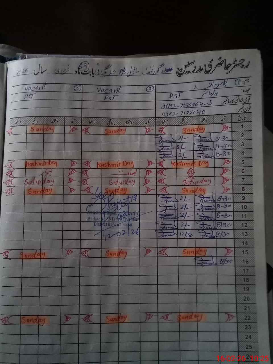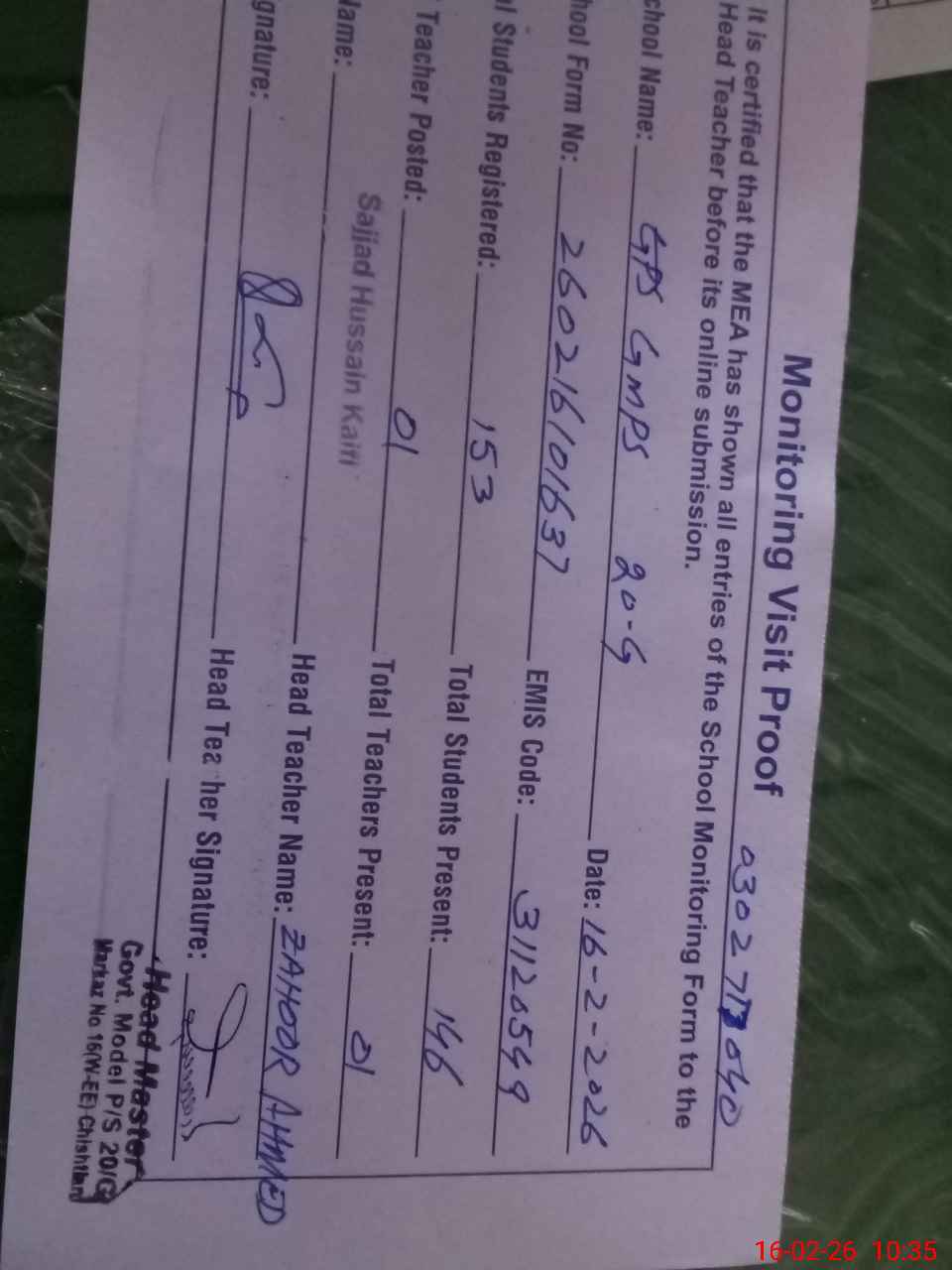 | Name: Za**** Ah**** Designation: (School Headmaster's/Headmistress's) PST Phone/Cell Number: 03**** |