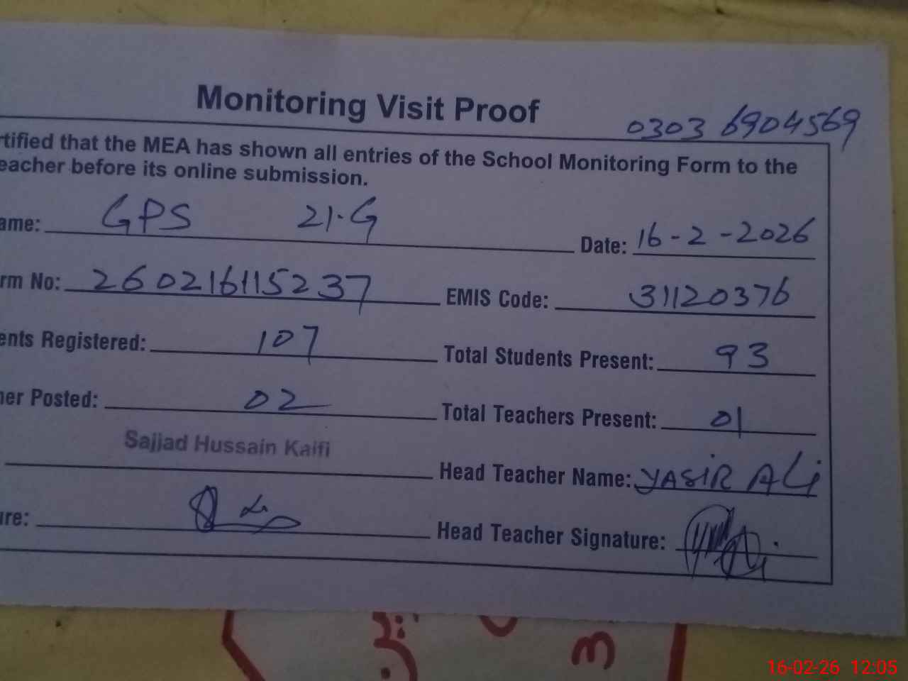 | Name: YA**** Al**** Designation: (School Headmaster's/Headmistress's) PTS Phone/Cell Number: 03**** |