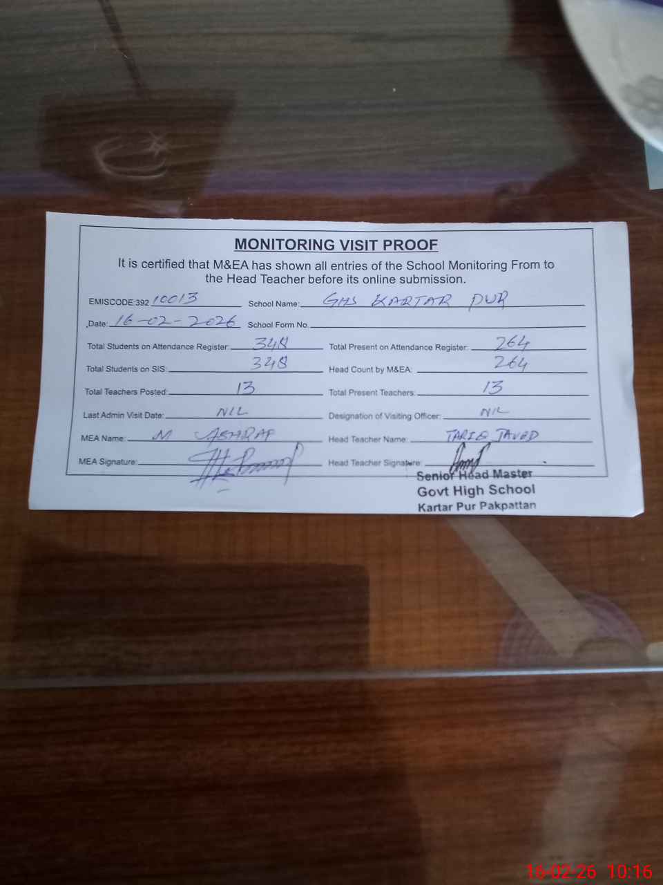 | Attendance Register | Head Teacher | MEA with School | Visit Proof |
