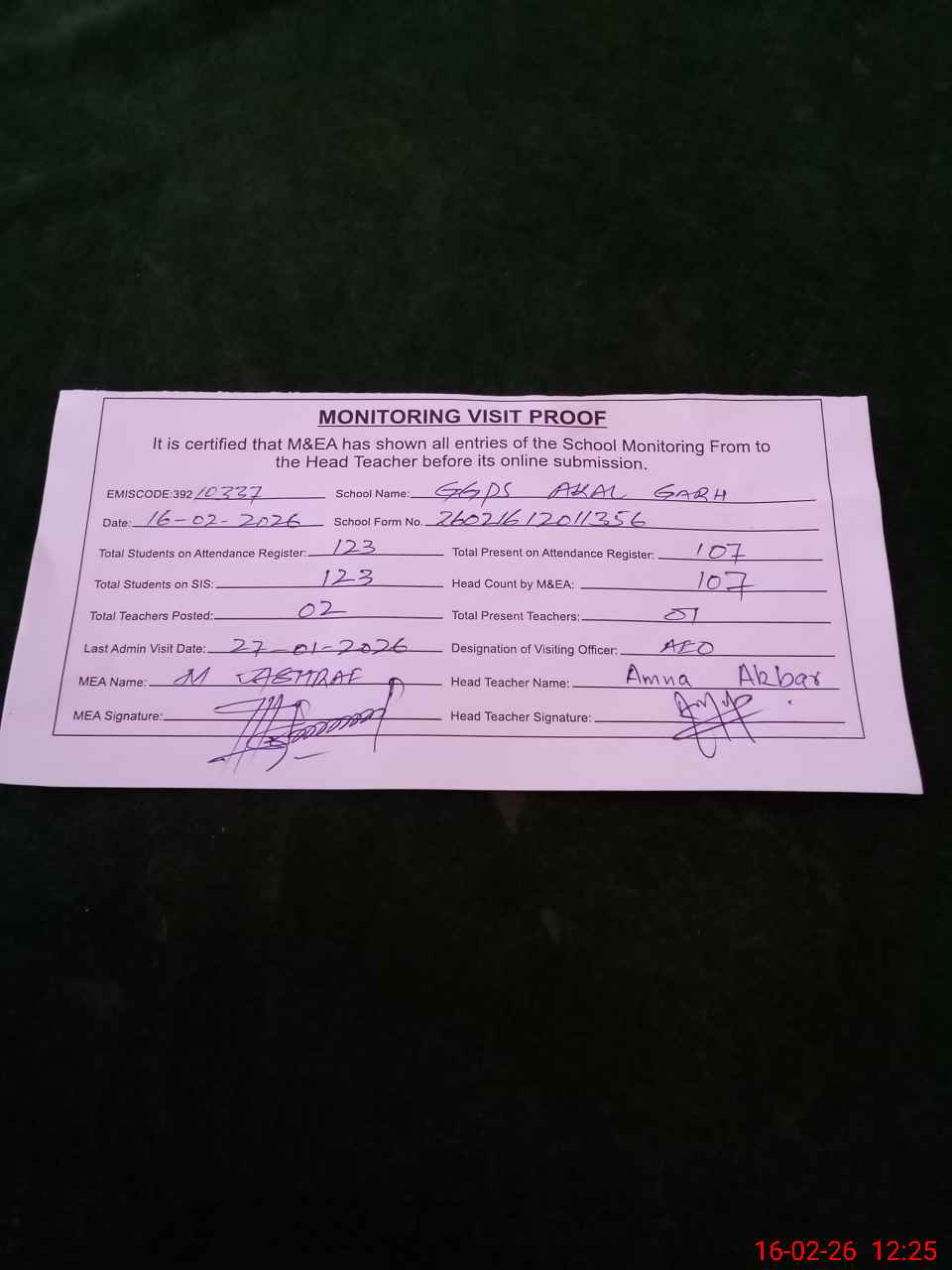 | Attendance Register | Head Teacher | MEA with School | Visit Proof |