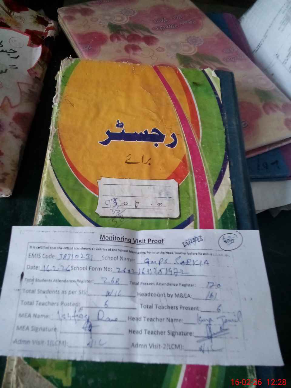 | Remarks (Use Separate Page if Required): NSB Teachers Rehana Shafiq n Care giver Bass Bibi all are Physical n documentarily absent without any officials,Hard copy record more over No Record of any type of these teachers available in school its seems to be ghost teachers n Fake attendance marked on Register Register Pics are attached No water pump no bore is available Water is being arranged from outside | |||||