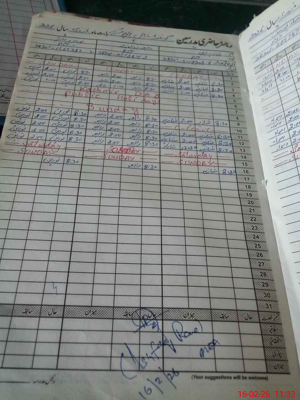 | Total no. of Classrooms: 6 No. of Classrooms Used for Teaching: 6 No. of Classrooms Storing Old Furniture, FTBs, etc: 0Comments if Any: NSB Teachers Rehana Shafiq n Care giver Bass Bibi all are Physical n documentarily absent without any officials,Hard copy record more over No Record of any type of these teachers available in school its seems to be ghost teachers n Fake attendance marked |