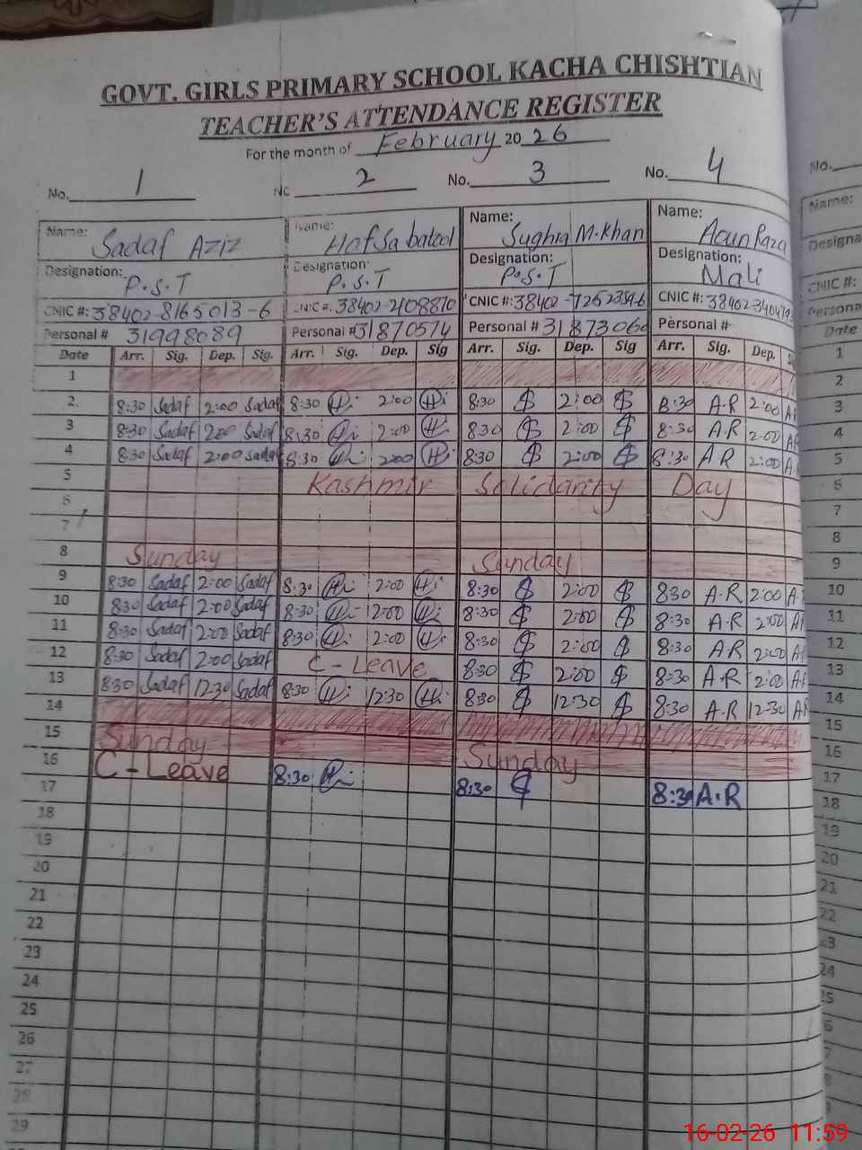 | CNIC | Full Name | Designation | R/C | Absence during last cal. month |