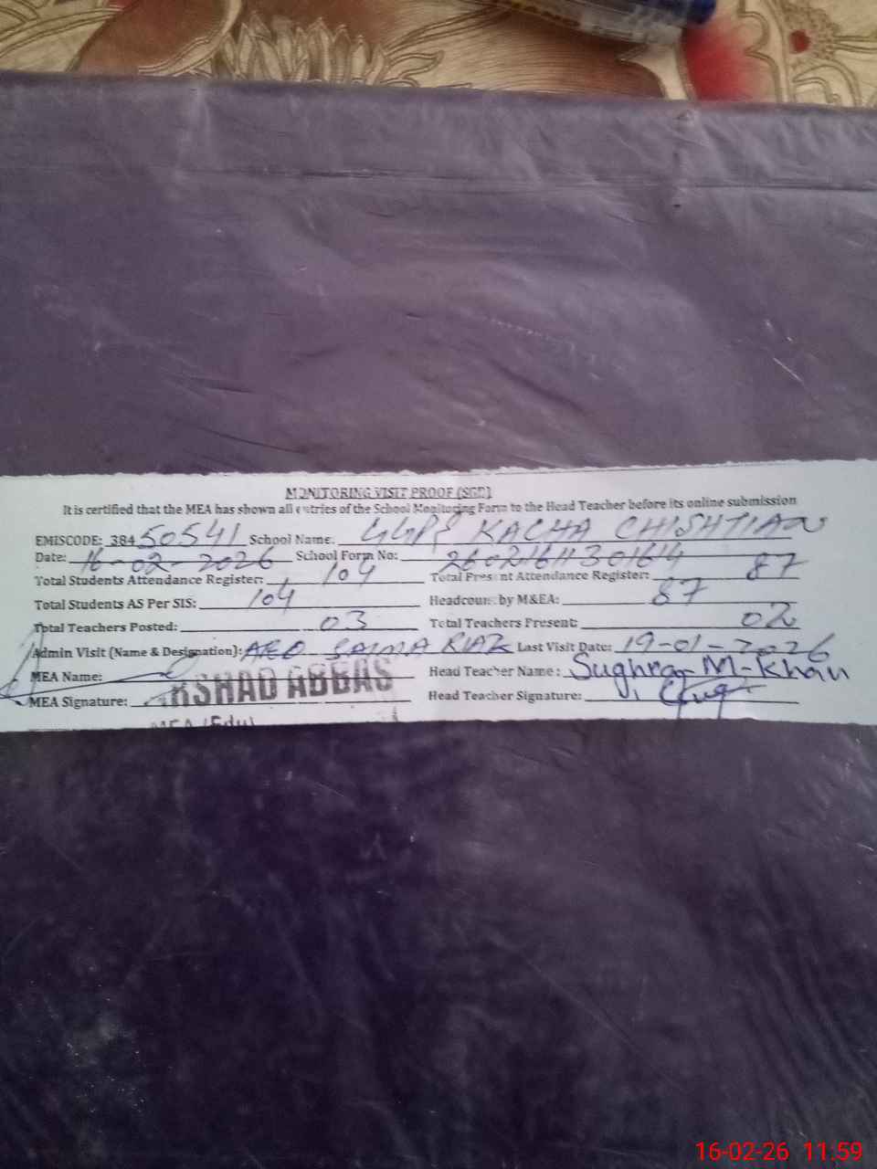 | Attendance Register | Head Teacher | MEA with School | Visit Proof |