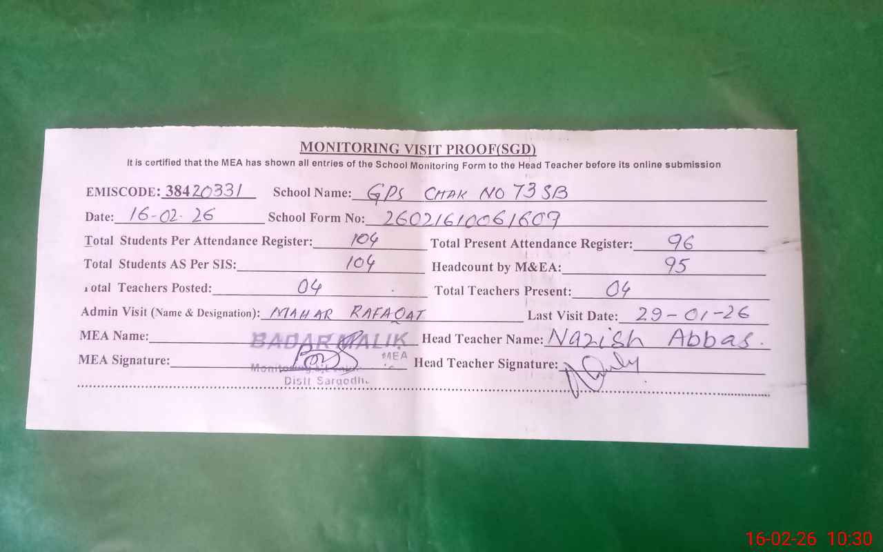 | EMIS Code: 38420331 | Name of School: GPS CHAK NO.73 SB | |||