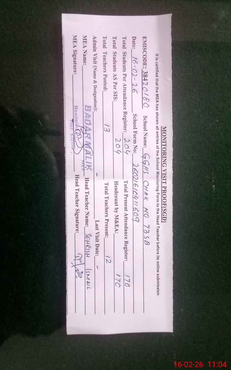 | EMIS Code: 38420180 | Name of School: GGHS CHAK NO.73 SB | |||