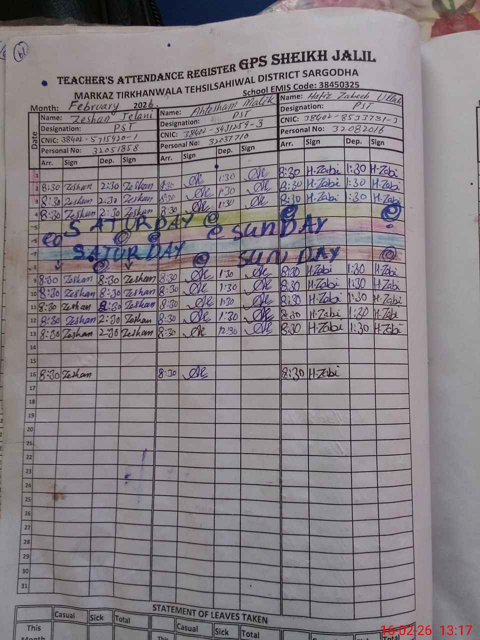 | CNIC | Full Name | Designation | R/C | Absence During Last Calender Month |