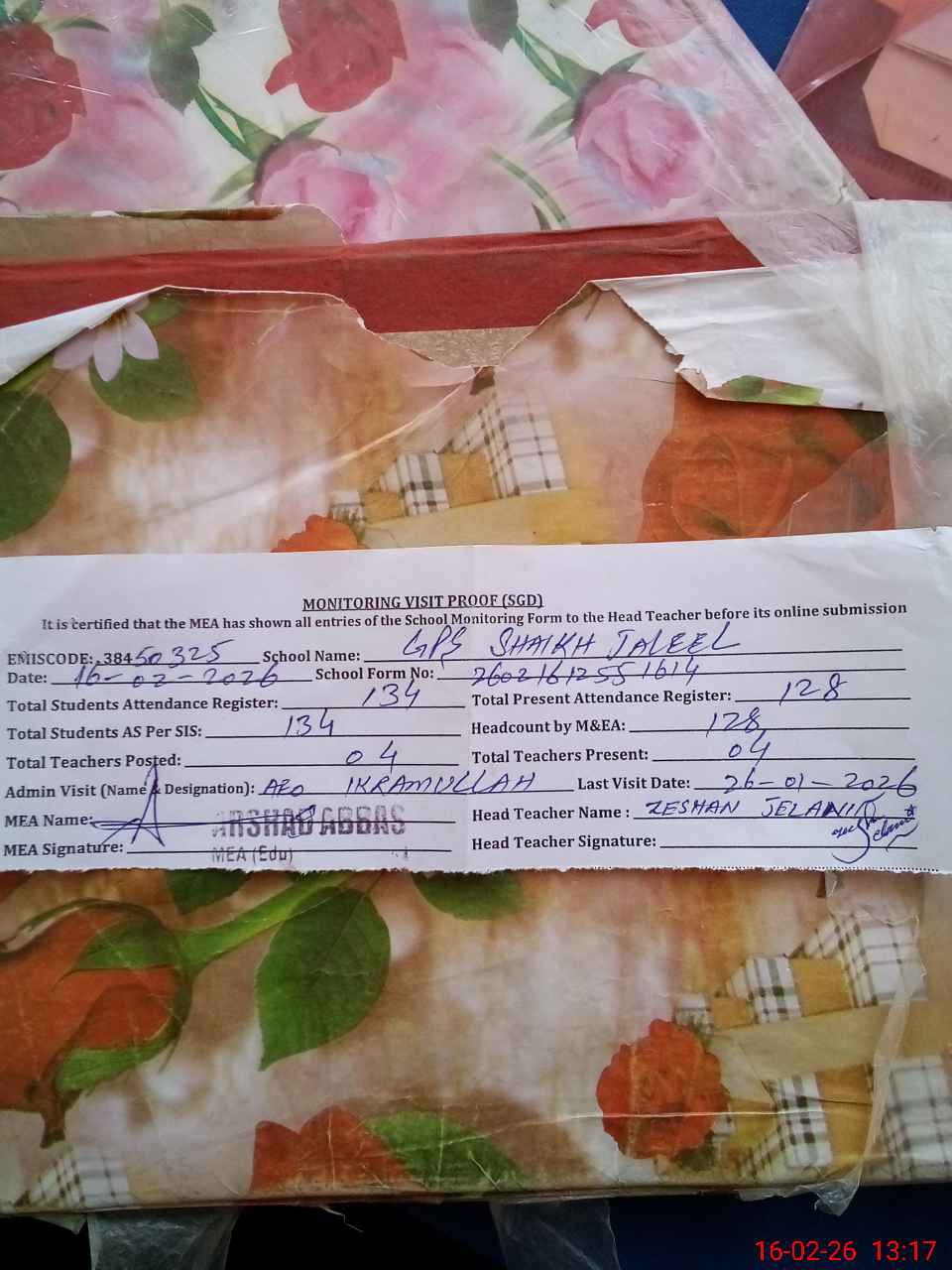 | Attendance Register | Head Teacher | MEA with School | Visit Proof |